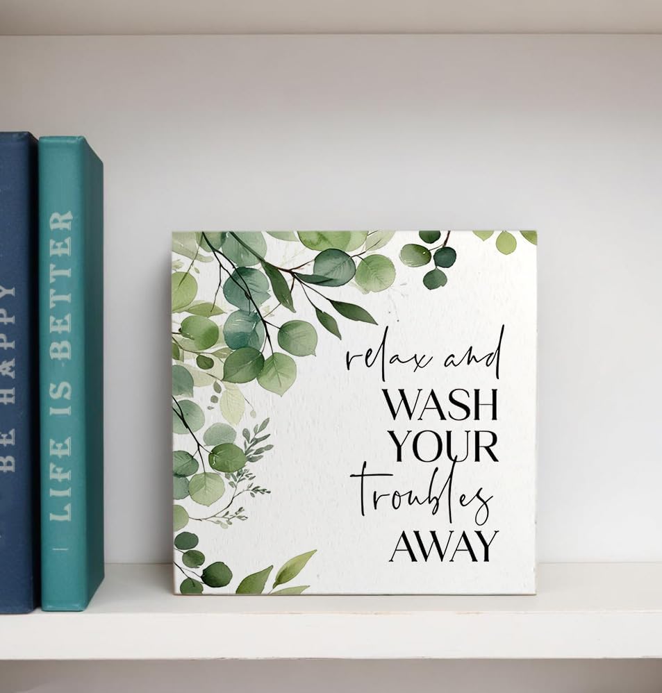 Funny Bathroom Signs, Wash Your Troubles Away Funny Bathroom Wooden Box Sign, Eucalyptus Botanical Wood Signs Plaque for Restroom Washroom Toilet Counter Shelf Table Decor, 5x5 Inch