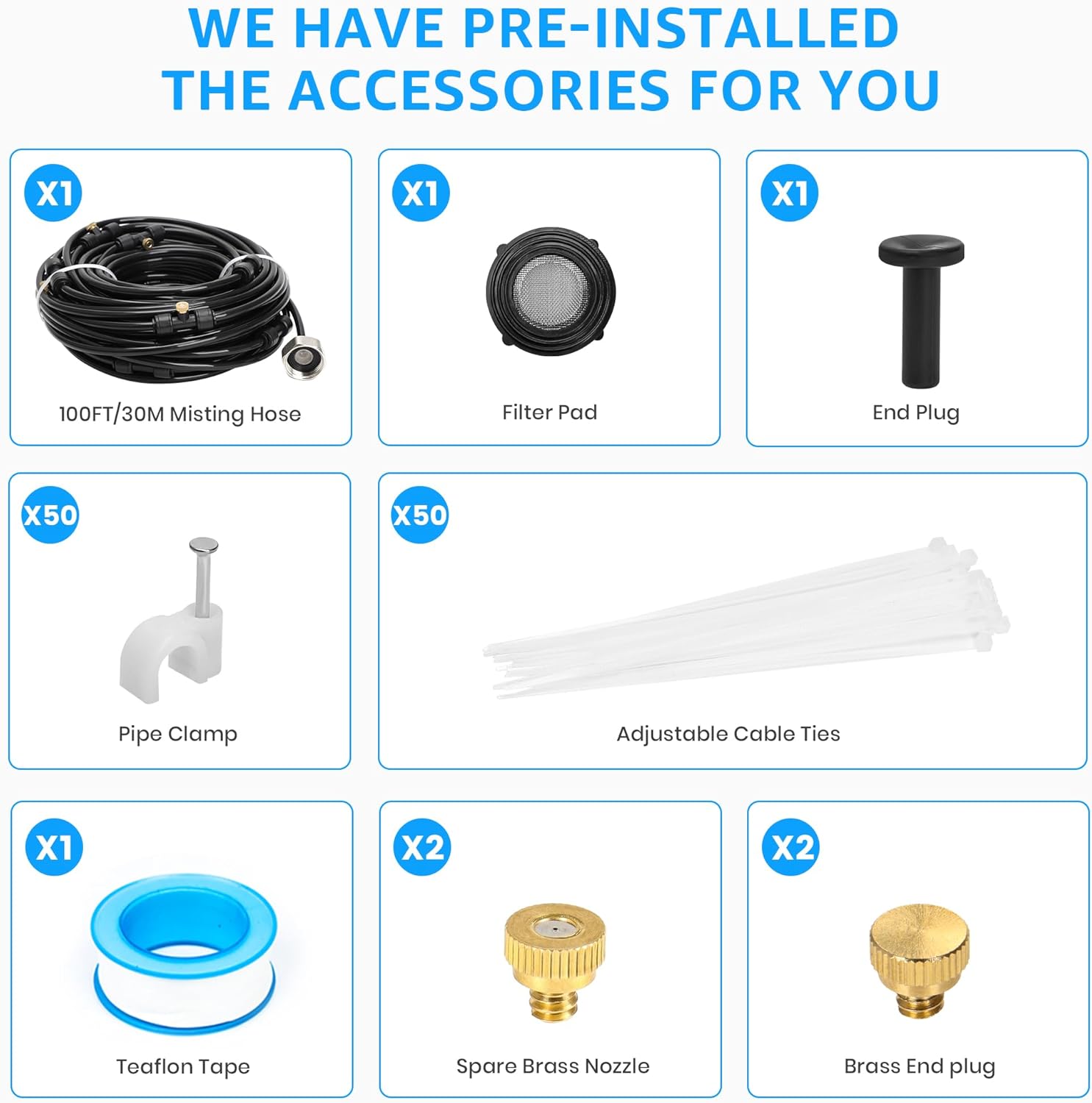 - 【4-in-1 Outdoor Master Solution】Cooling + Watering + Dust Control + Play Zone! Evenly mist plants in greenhouses, reduce heat stress for horses in corrals, humidify chicken coops, or create a kid-friendly mist playground. Works seamlessly with shade sails, pergolas, and barns.