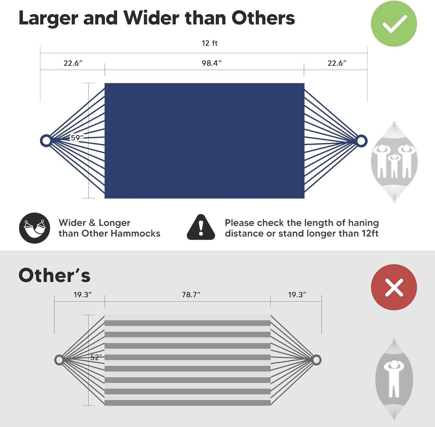 - Larger Bearing Capacity: The heavy duty hammock's total length (from loop to loop) is 144 Inches while the bed size is 98โlong X 59โwide, making it perfect for couples