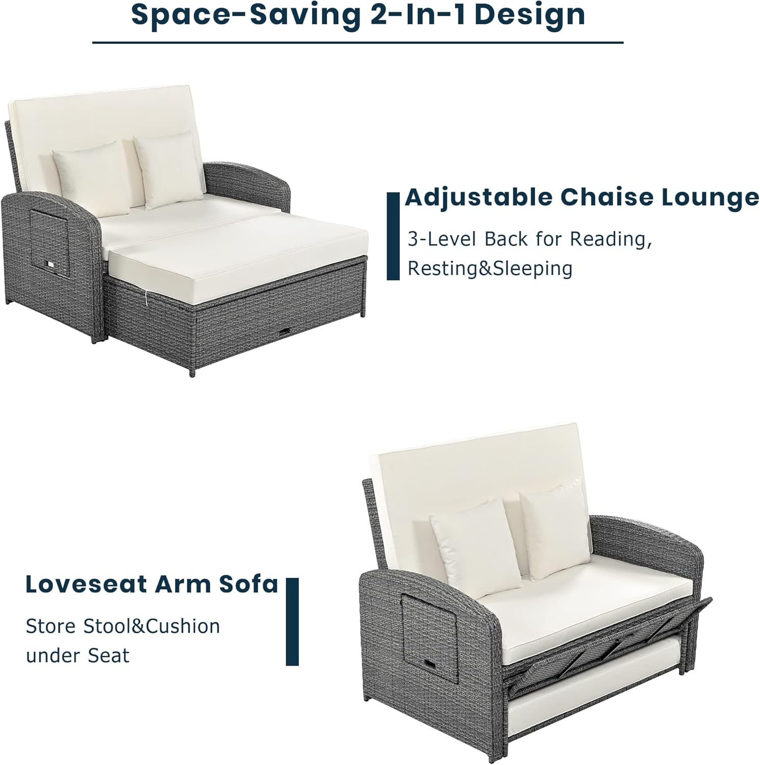 43.7” Patio Rattan Daybed Set, PE Wicker Rattan Double Chaise Lounge, 3-Level Adjustable Back and Cushions, Free Furniture Protection Cover, White