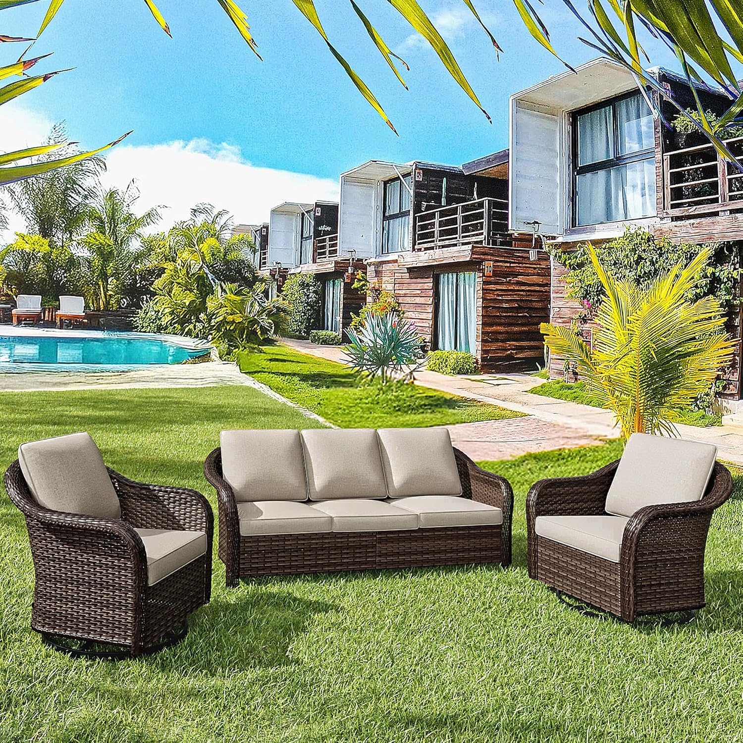 - Size : 3 PCS 3-seat Sofa & Swivel Chairs Set