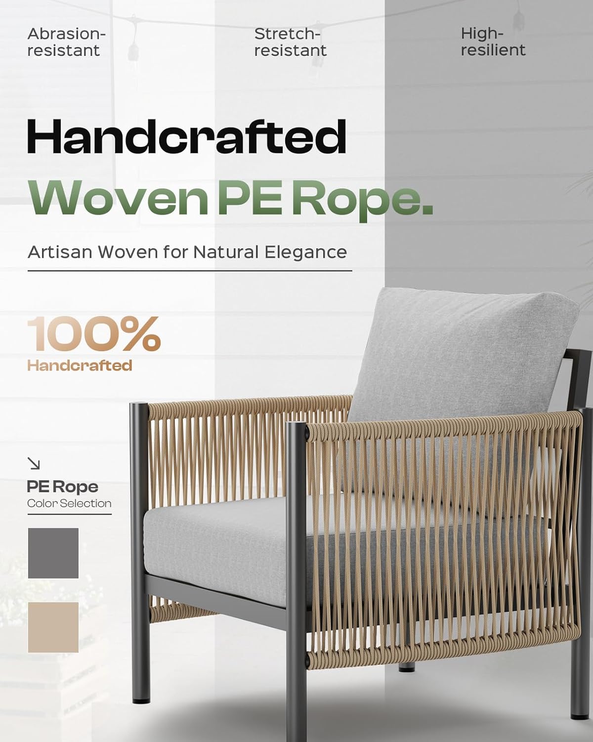 - Durable Design:This modern outdoor furniture features a high-strength all-aluminum frame that is far stronger and more durable than typical metal frame. And the powder-coated surface enhances weather resistance. It embodies all the exceptional qualities that an aluminum patio furniture set should have. The Olefin fabric combines durability with UV protection for years of outdoor enjoyment. The HDPE handcrafted rope has exceptionally high strength and toughness, offering wear resistance and a longer lifespan compared to traditional wicker, setting it apart from other wicker outdoor furniture