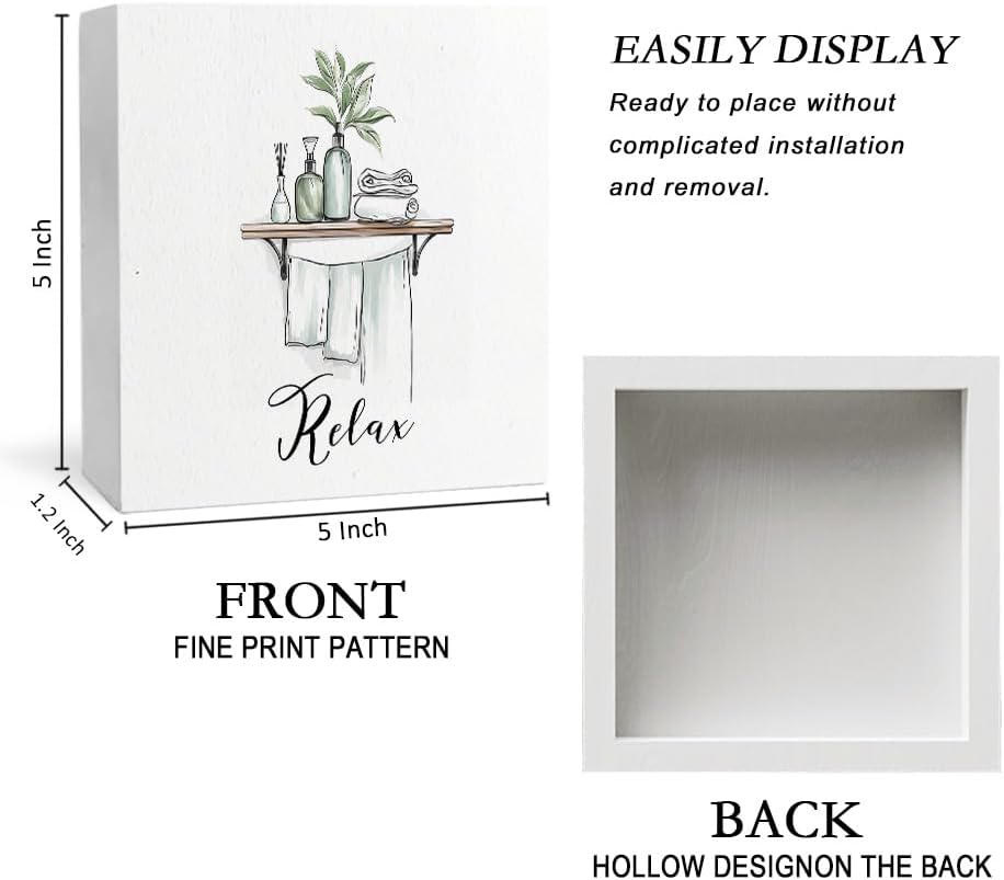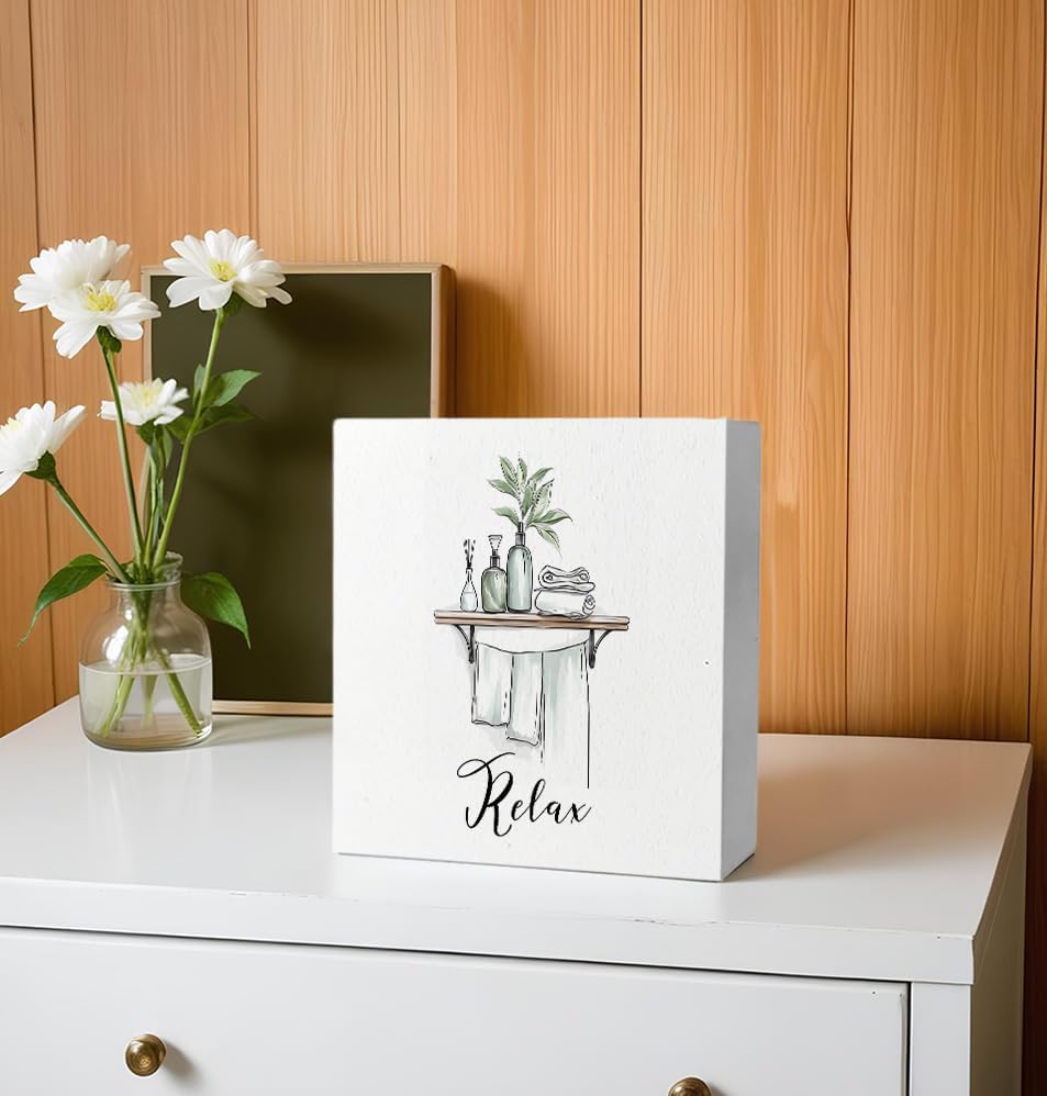 Relax Funny Bathroom Wooden Box Sign, Eucalyptus Botanical Wood Signs for Restroom Bathroom Toilet Half Bath Shelf Counter Decor, 5x5 Inch