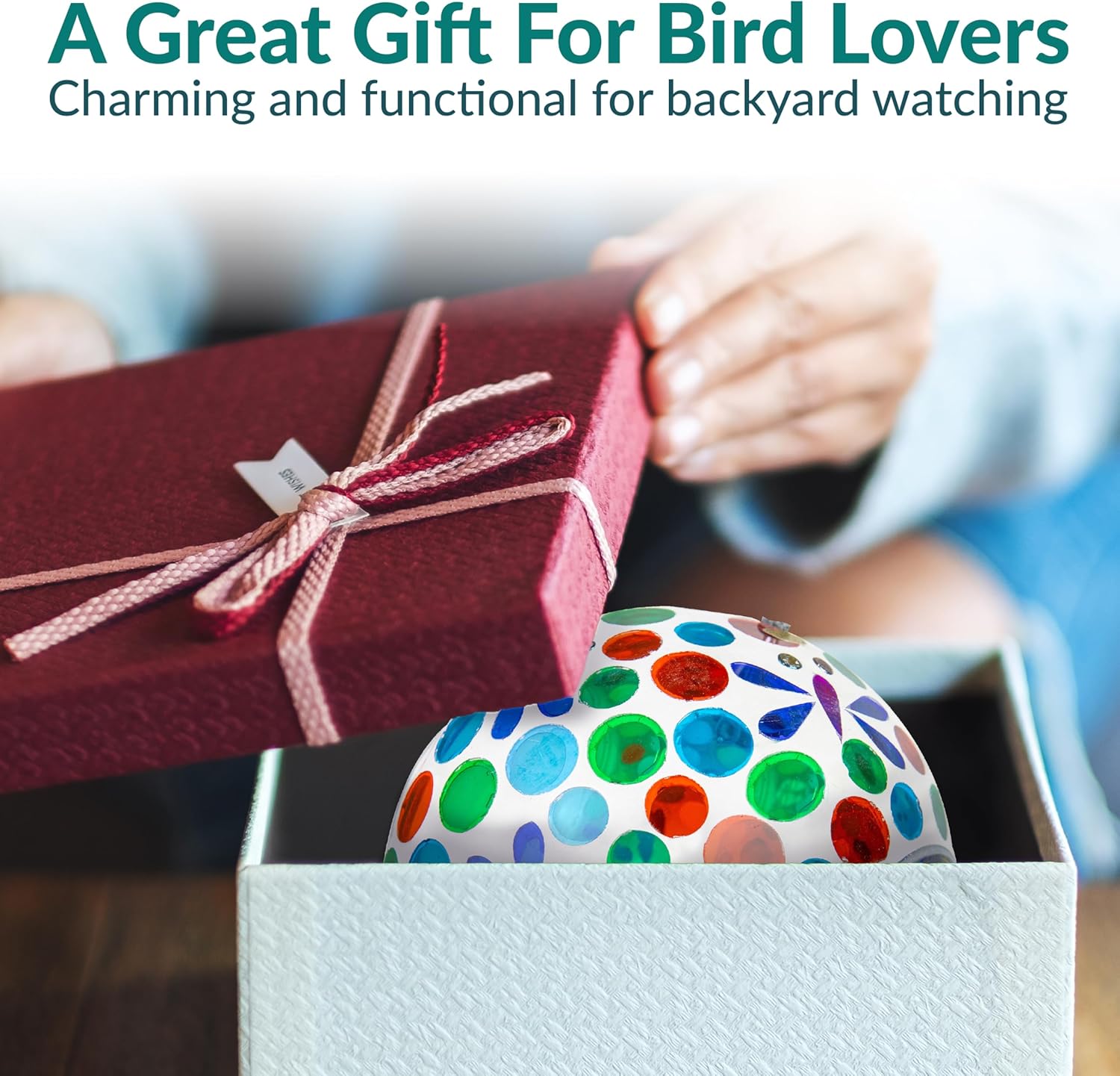 - ATTRACT BIRDS TO THE YARD: This cute bird feeder features vibrant colors and a mosaic glass construction that is sure to appeal to humans and birds alike. The bright colors and reflective material will help attract a variety of bird species to the feeder including cardinals, finches, sparrows, and more. Plus, it will add a stylish pop of color to any patio decor. The open fly-through design also makes it easier for birds to access the seed, encouraging them to come back again and again.