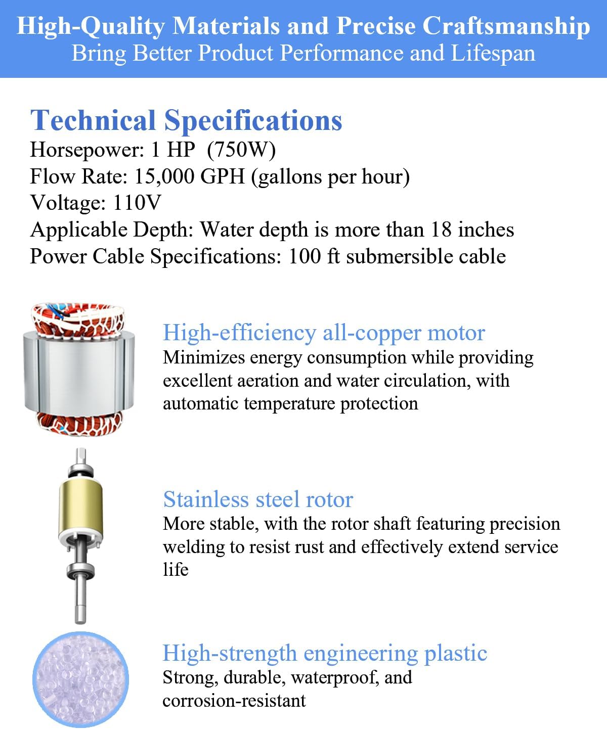 - Energy-Efficient & Easy Installation β Plug-and-play design connects to standard 110V; includes 100-foot waterproof power cord and support cable; operates in water as shallow as 18 inches.