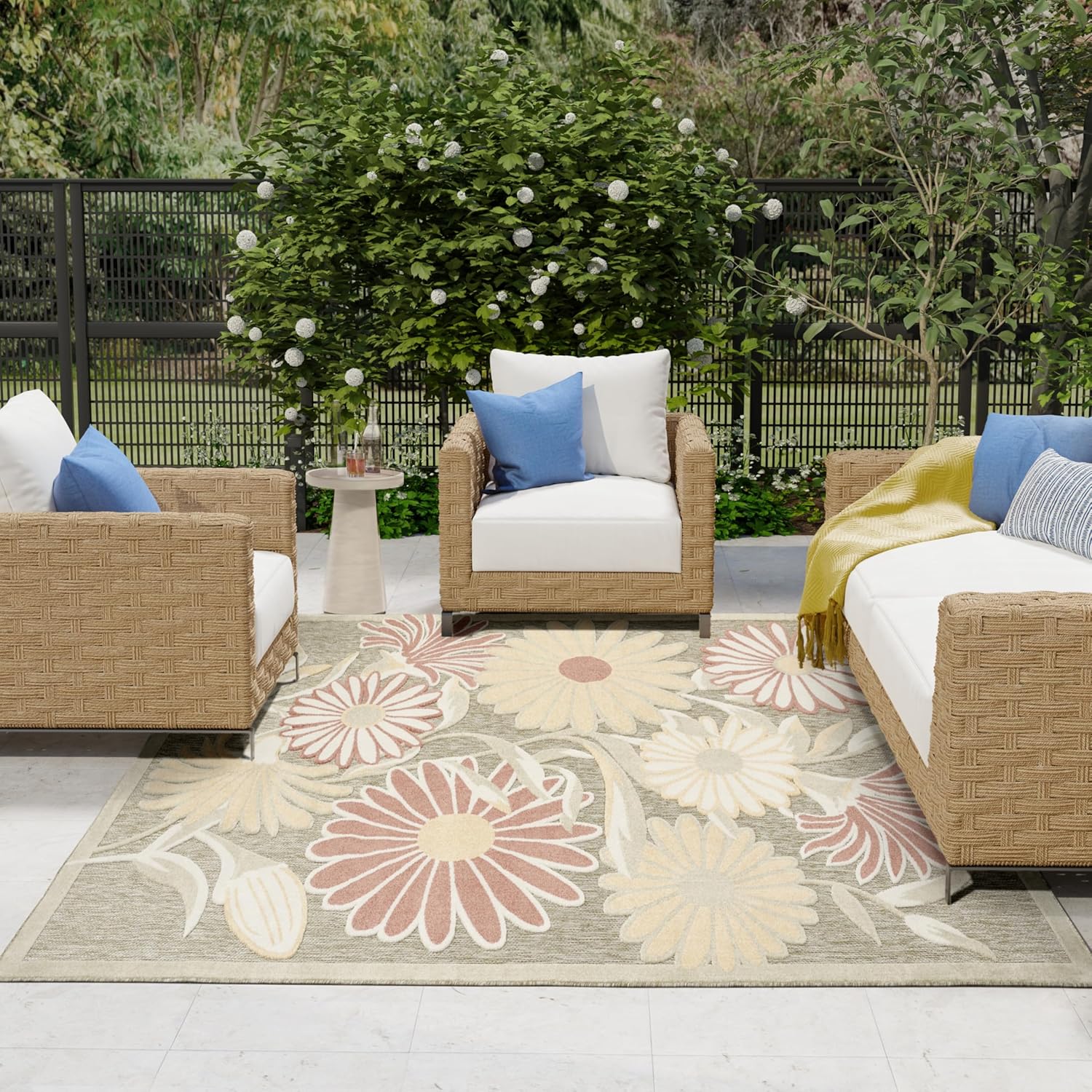 - Floral outdoor rug adds a subtle sense of depth to your space