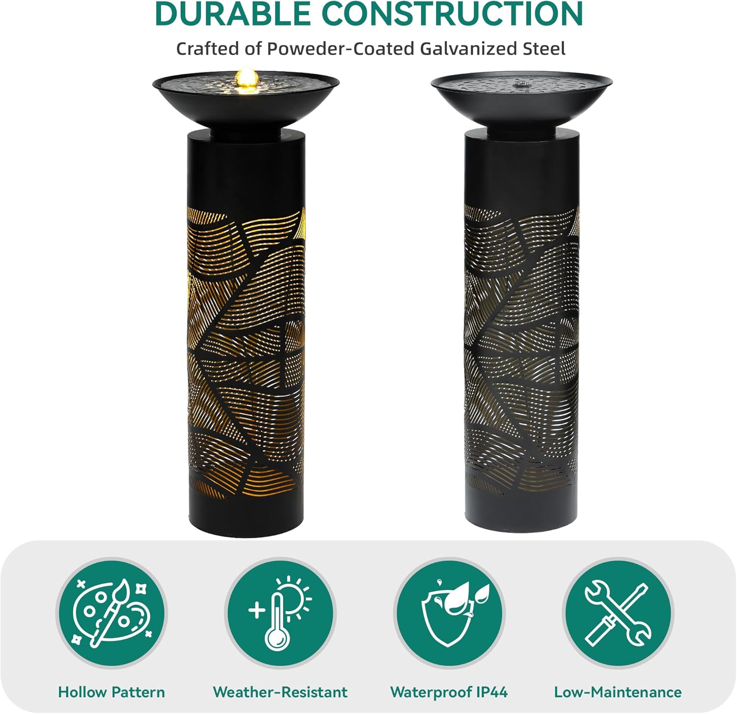 - ARTISTIC&ELEGANT DESIGN: This stunning Outdoor metal cutout fountain features modern laser - cut geometric patterns. The metal cutouts cast captivating lights and shadows, adding a touch of artistic elegance to your outdoor space. Measuring 14.37"L X 14.37"W X 36.02"H, focal point for any garden, patio, or outdoor living space.