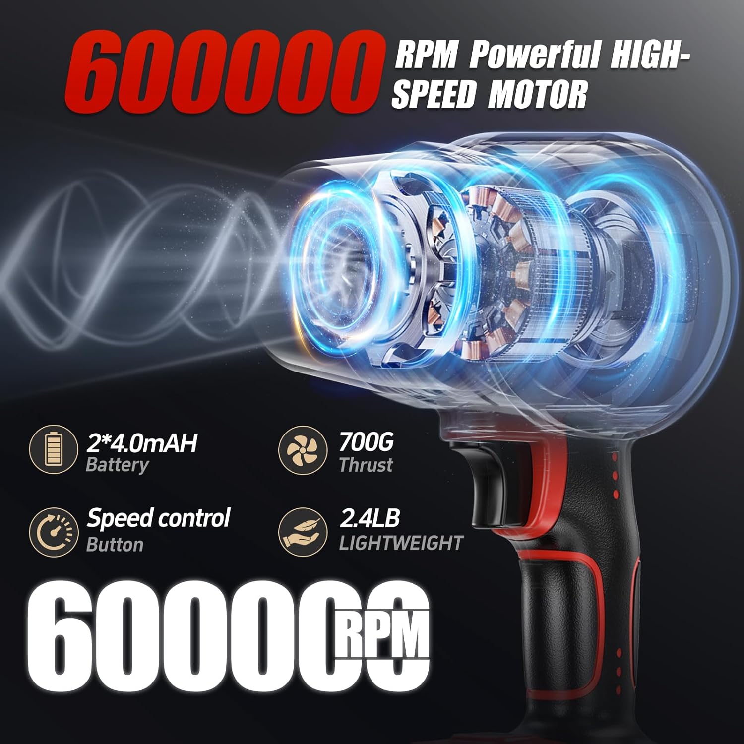 Leaf Blower Cordless with 2x4.0Ah Batteries,600000RPM Turbo Jet Blower, Electric Small Blower with Extended Nozzle,Lightweight Handheld Leaf Blower for Lawn Patio Care, Blowing Leaves, Snow,Dust