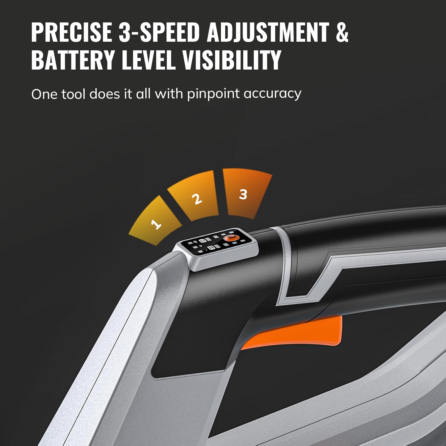 - ă3-Speed Settings with Smart Control Panelă Maximize your cleaning versatility with this cordless handheld blower featuring three precision-engineered speed modes. The smart digital display shows real-time battery status and power output, allowing you to optimize performance for each task. This leaf blower provides intelligent power management for extended runtime and superior control