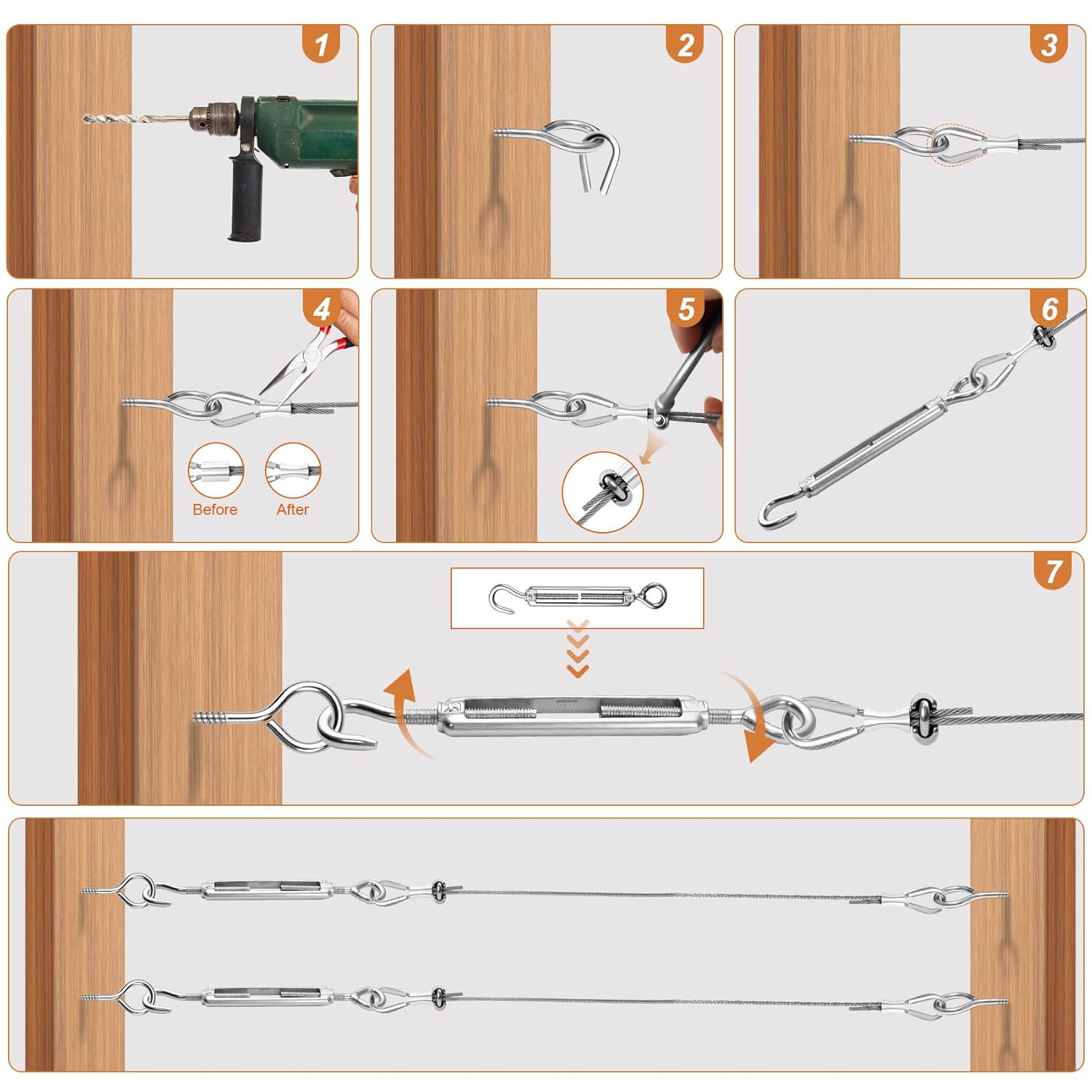 - Easy to Install: The stainless steel cable kit is compact and easy to assemble and disassemble. First, cut the cable length as required. Then use the matching thimble and aluminum sleeve to fix the end, and fine-tune the tightness through the adjustable kink tensioner