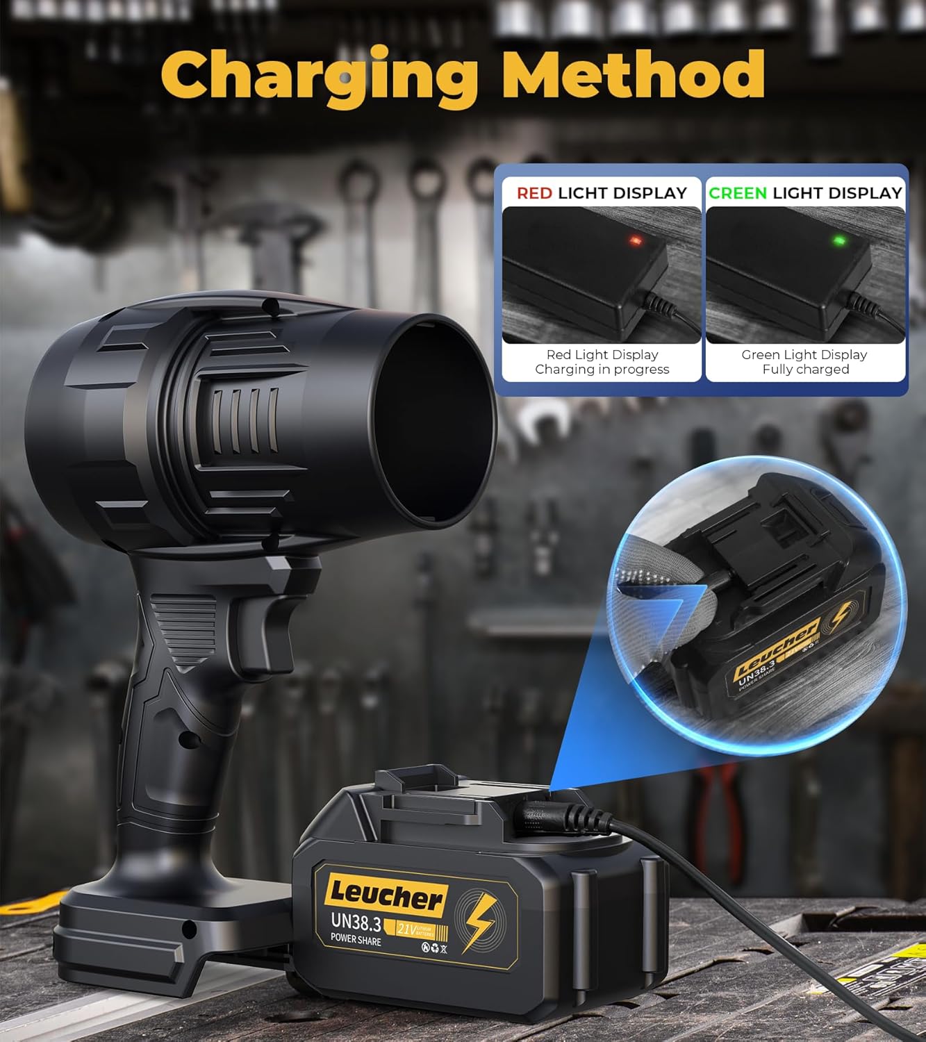 - ăDual Batteries & Long-Lasting RuntimeăEquipped with two 21V-3000mAh lithium batteries, this handheld leaf blower provides 50 minutes of continuous runtime (25 minutes per battery), ideal for large-scale tasks like clearing leaves, snow, or debris from gardens, driveways, or workshops. The rapid charger fully replenishes batteries in about 3 hours, with a clear LED indicator that shifts from red to green when fully charged. For extended battery life, store batteries fully charged when not in use