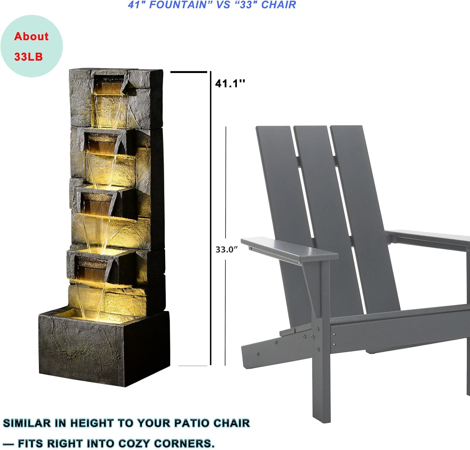 41.1" Garden Water Fountain Outdoor – 5-Tier Modern Cascading Resin Waterfall Fountain with LED Light, Mossy Stone Look, Floor-Standing Outdoor Water Feature for Patio, Yard, Deck, Home Décor