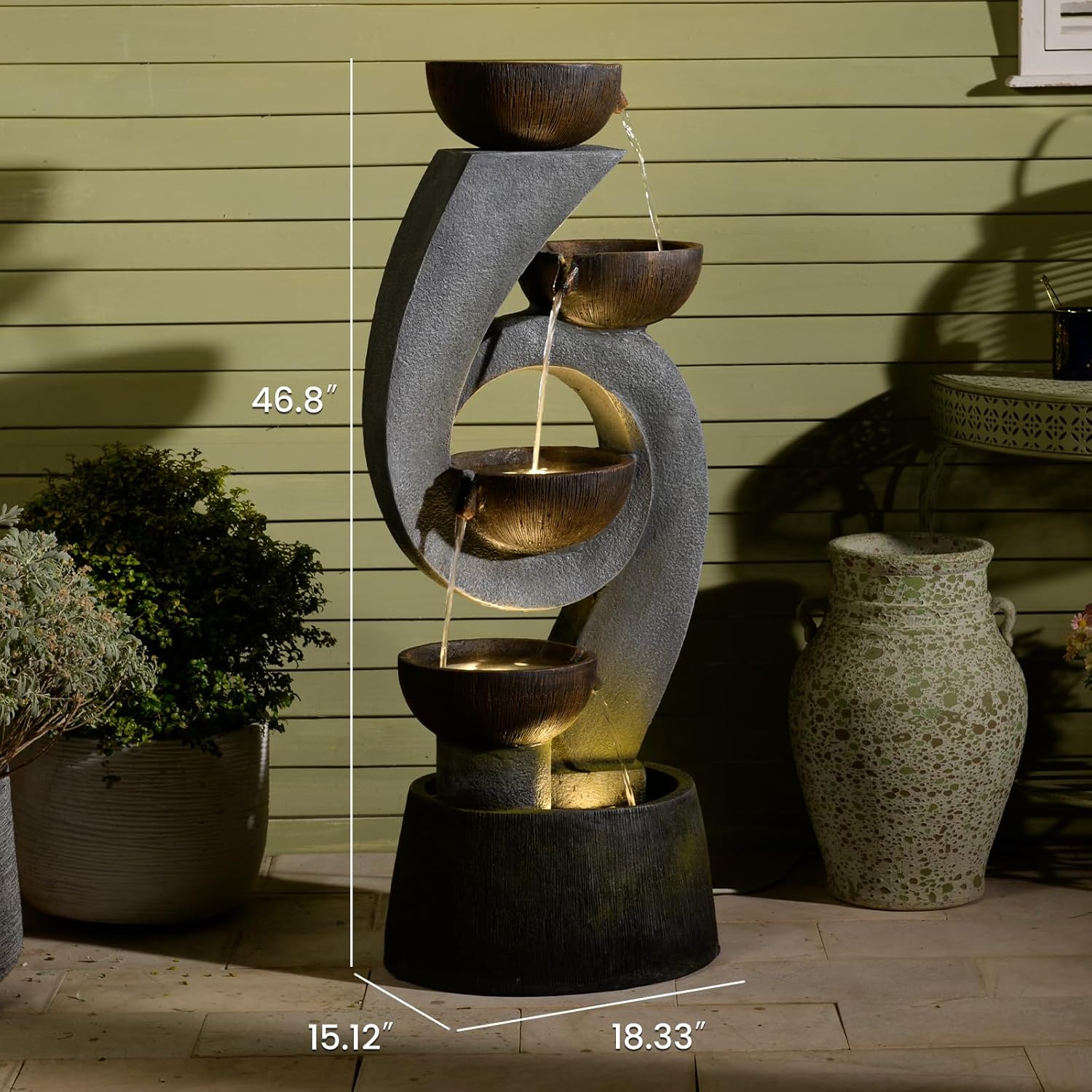 46.8''H Outdoor Water Fountains - 5-Tiered Garden Fountains Outdoor for Patio, Yard, Balcony, Porch, Modern Resin Waterfall Feature for Outside with Light, Cascading Bowl Water Feature Gray