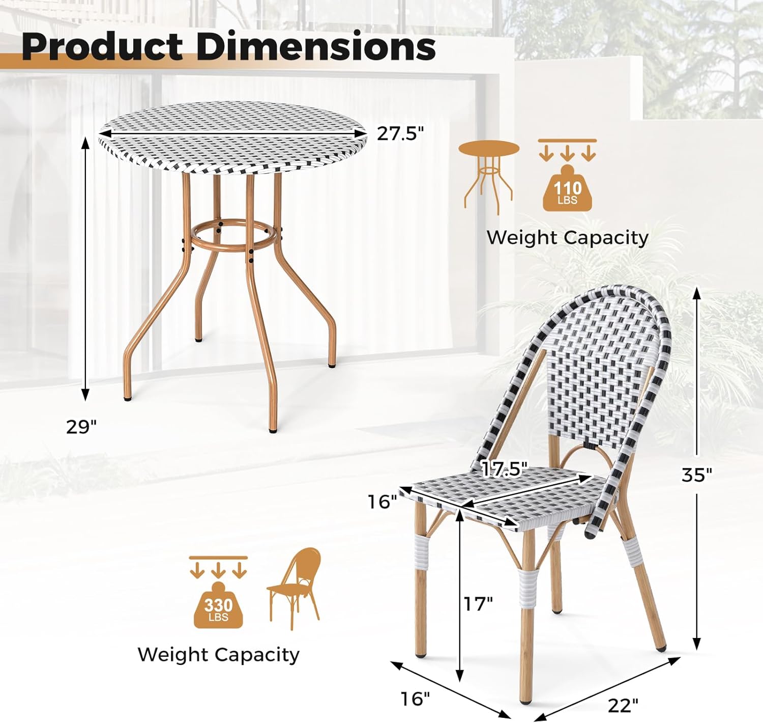 - Versatile Outdoor Ensemble: Ideal for intimate outdoor dining or relaxation, this bistro set is perfect for backyard, porch, garden or poolside. Note: Please avoid rain exposure for prolonged service life. Dimensions of table: 27.5β Γ 29β (Dia Γ H). Dimensions of chair: 22β x 16β x 35β (L x W x H).