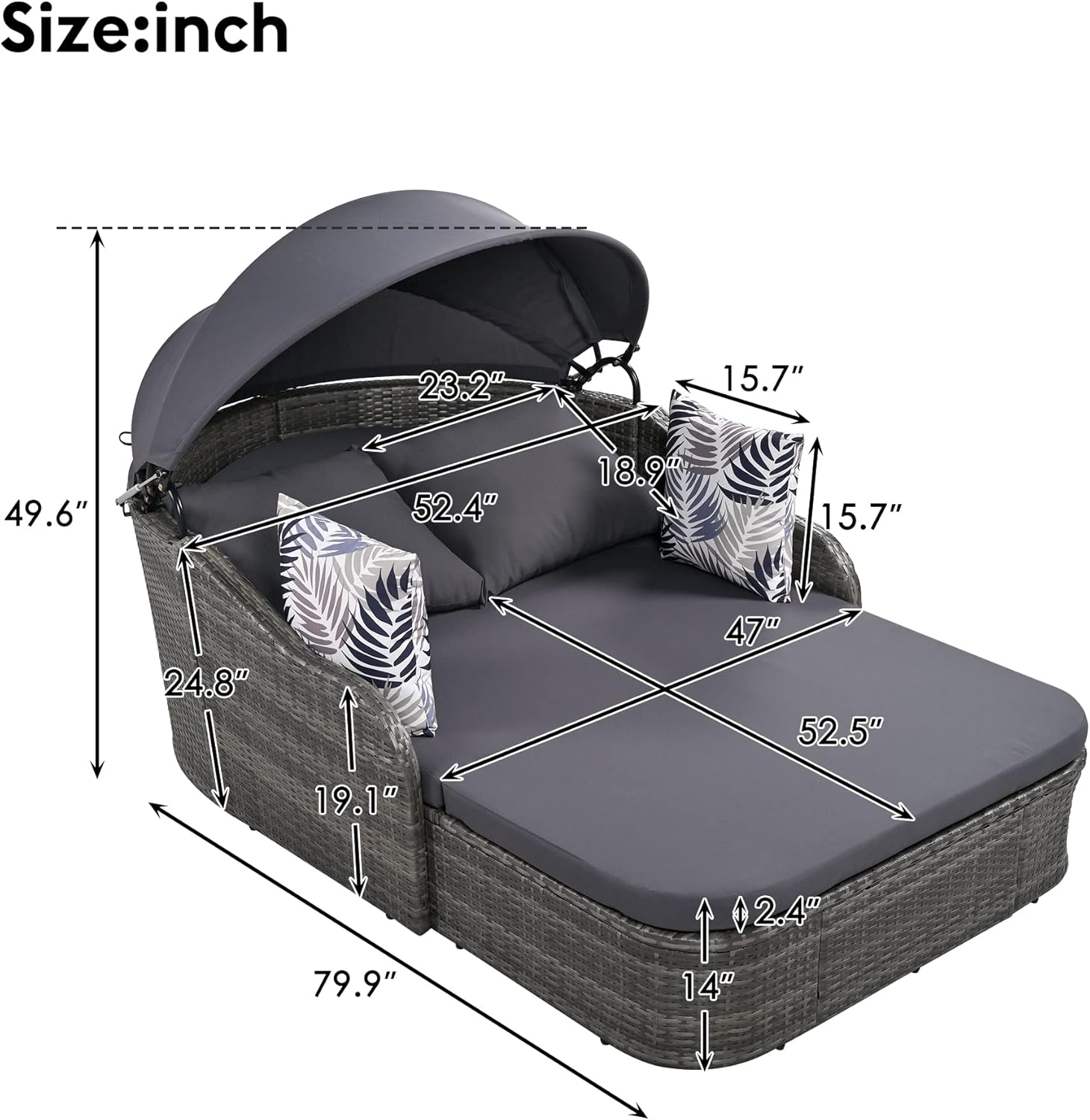 79.9" Outdoor Daybed with Retractable Canopy, PE Rattan Wicker Patio Daybed, 2-Seater Loveseat Lounge Bed Conversation Daybed, Gray Wicker Cushion
