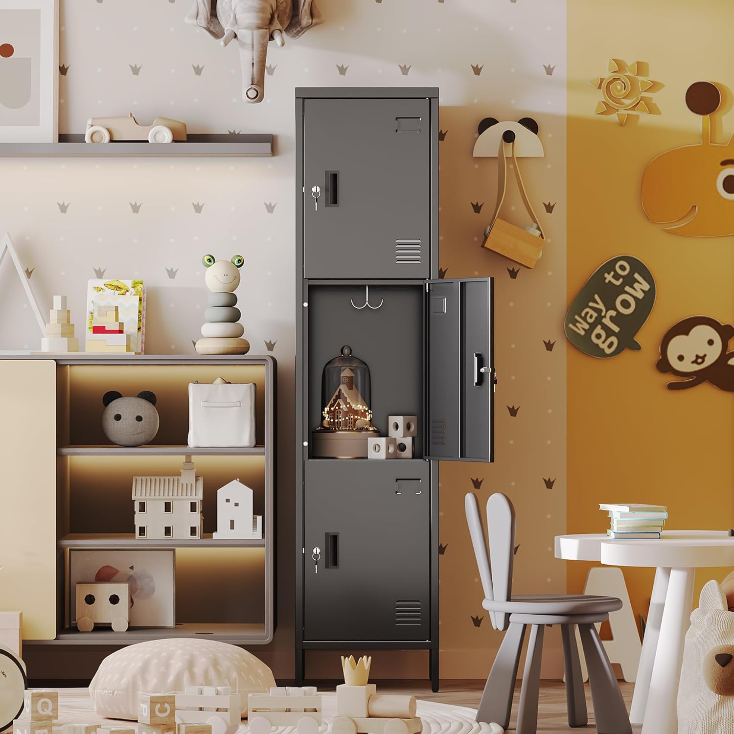 METAN Metal Storage Employees Lockers with 3 Lockable Doors and Hooks,66''H*16''W*16''D Locking Storage Cabinets for Small Spaces,Home,School,Gym,Assembly Required,Black