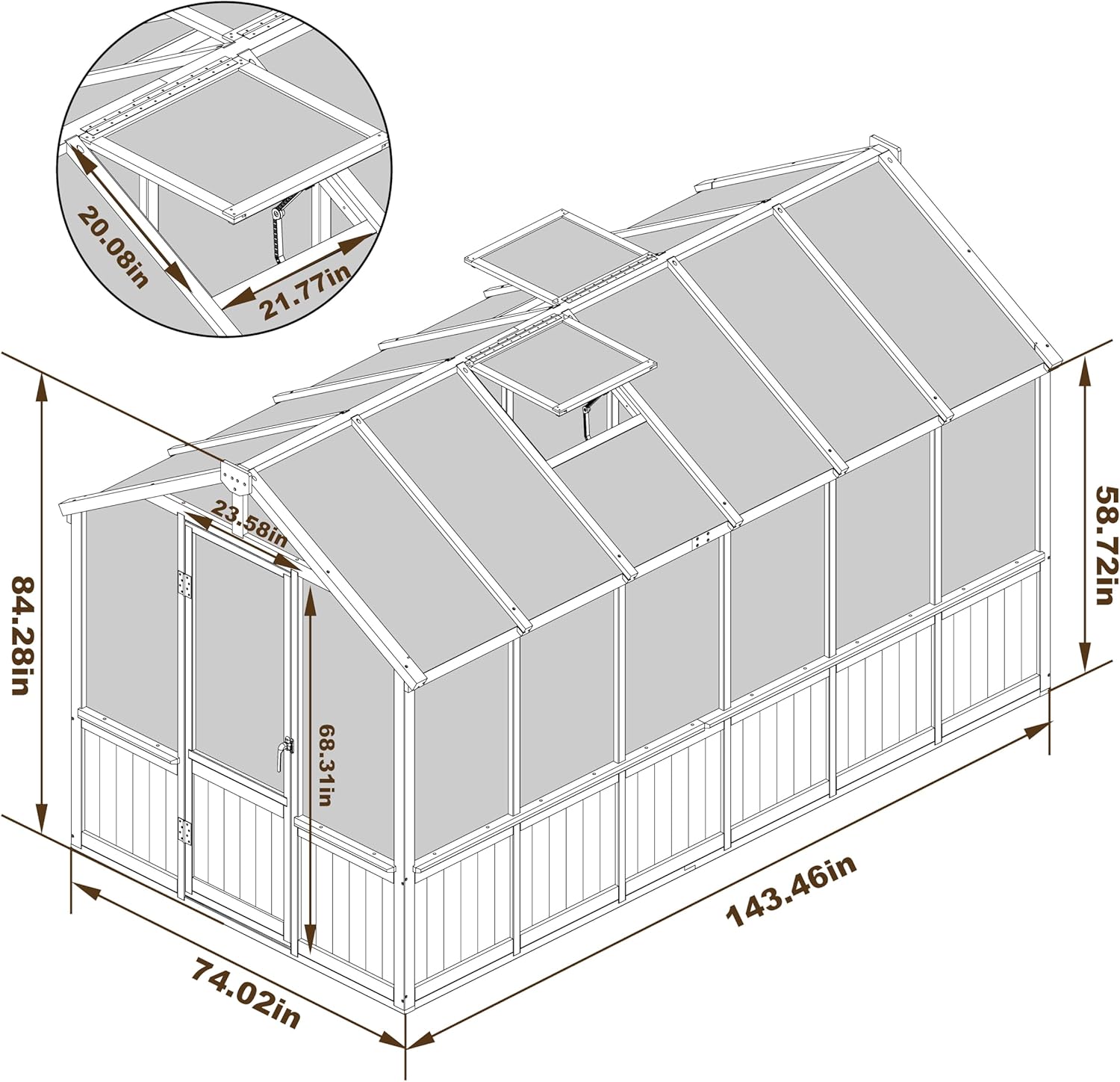 - DIMENSIONS - The overall size of greenhouse: 143.46"'W x 74.02"D x 84.28"H. The size of door: 23.58'' W x 68.31'' H. The clerestory dimension of greenhouse: 20.08''W x 21.77''L.