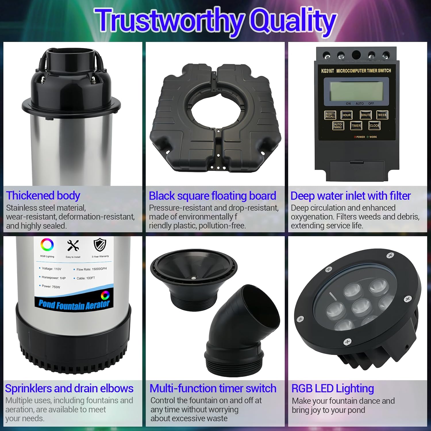 - [Multi-function Timer Switch]: Our floating fountain system features a multi-function timer, allowing you to manage your rgb fountain aerator with greater ease. It offers a 7-day programmable set: Daily, One Specific Day, Weekday, Weekend, Sunday Excluded, Mo-We-Fr only, Tu-Th-Sa only, Mo-Tu-We only, and more. It also features a Min Time of 1 Second (e.g., let the pump turn on at 9:00:00 AM and off at 10:30:00 PM). Enjoy the happiness brought to you by the RGB landscape fountain.
