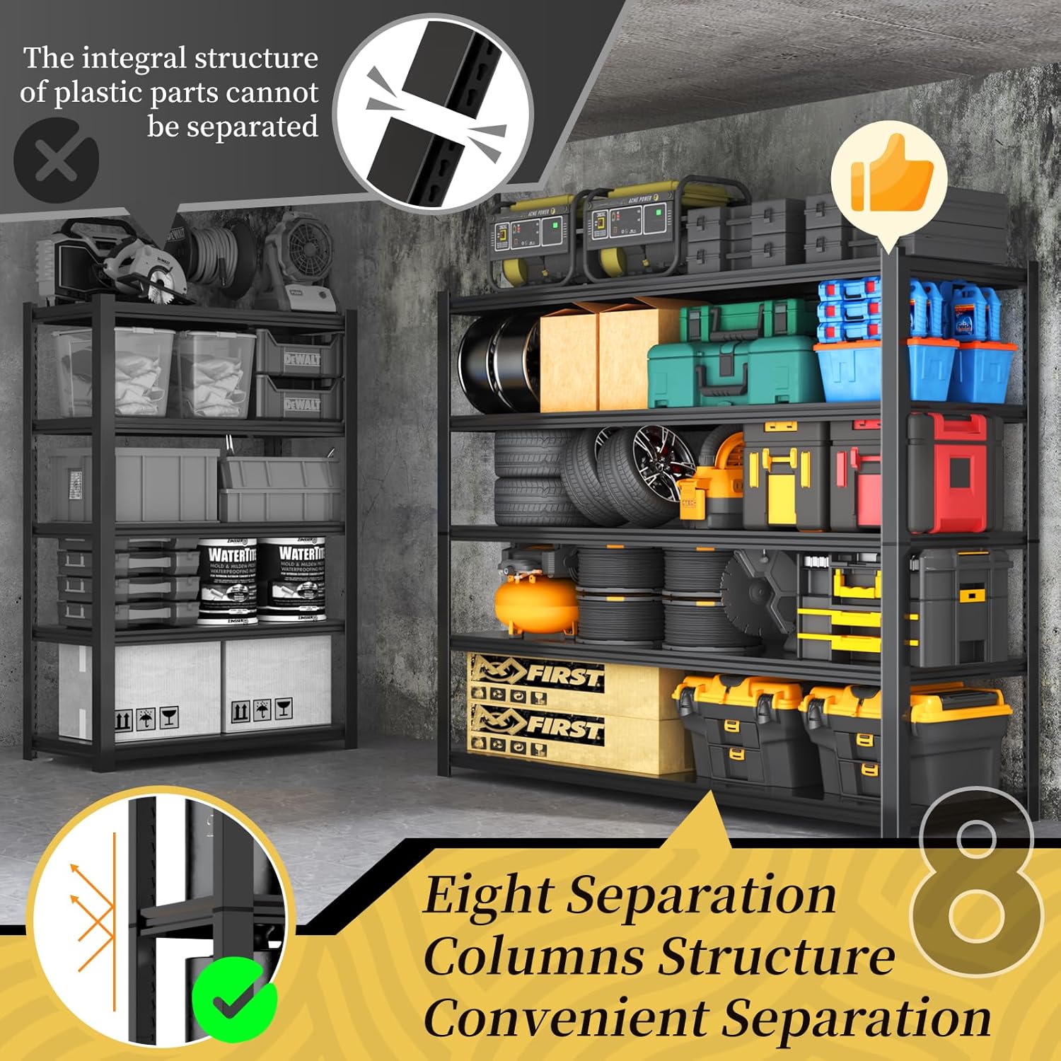 - Sturdy and Durable Construction: Built with high-quality metal and reinforced with double-thickened legs and an anti-rust coating, this shelving unit offers exceptional strength. Each shelf can hold up to 600 lbs, with a total weight capacity of 3002 lbs, making it ideal for heavy-duty storage needs.