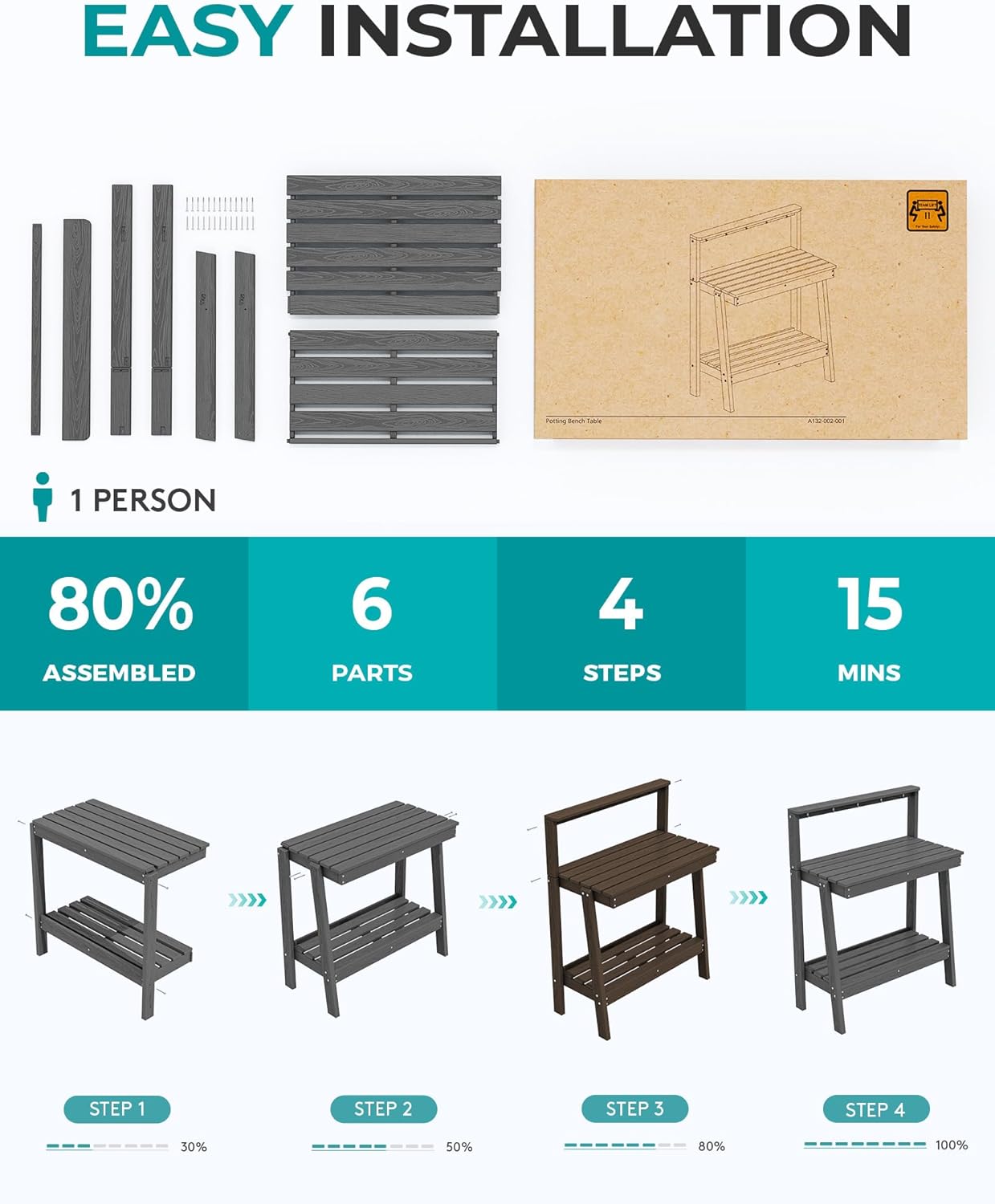 - Quick & Tool-Free Assembly: Everything you need for setup comes in the box. Just follow the straightforward instructions, and you can have your new garden work bench fully assembled and ready to use in under 20 minutesāno extra tools required.